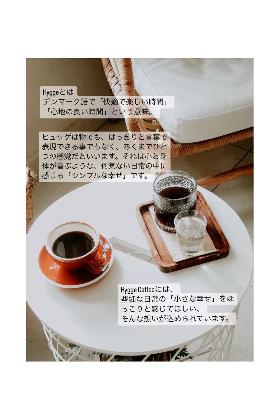 ヒュッゲは物でも、はっきりと言葉で表現できる事でもなく、あくまでひとつの感覚だといいます。それは心と身体が喜ぶような、何気ない日常の中に感じる「シンプルな幸せ」です。Hygge Coffeeには、些細な日常の「小さな幸せ」をほっこりと感じてほしい、そんな想いが込められています。